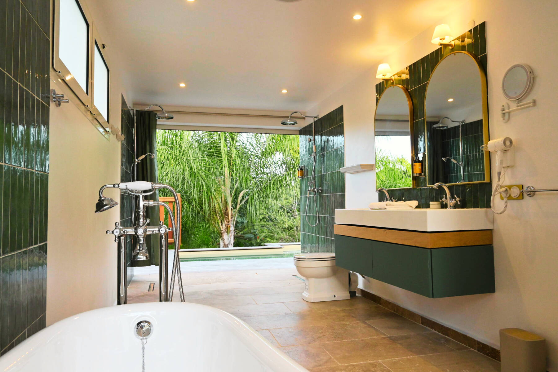 La salle de bain de $20\text{ m}^2$, véritable sanctuaire, propose une baignoire, deux douches intérieures et une douche extérieure sous les étoiles, pour une communion parfaite avec la lumière tropicale.