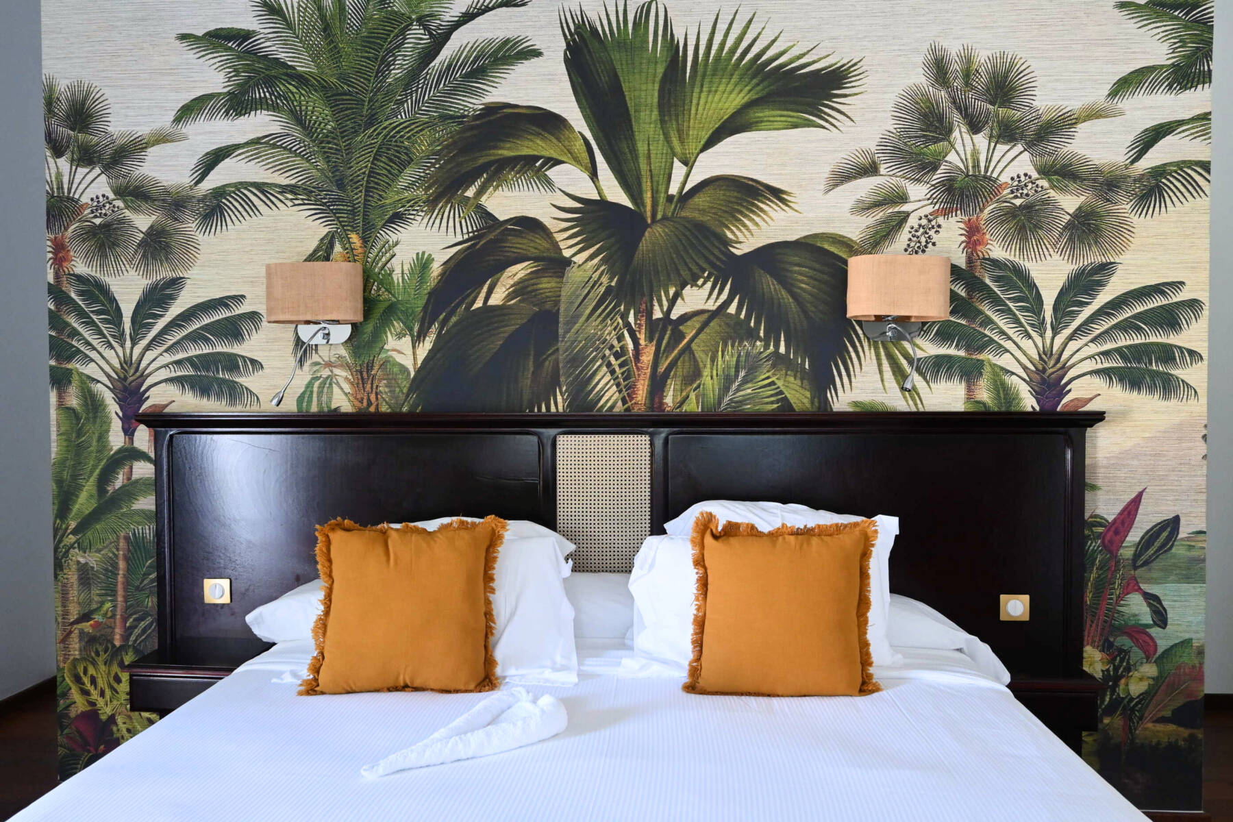 Espace Nuit : Un lit King-size haut de gamme faisant face à une fresque tropicale immersive.